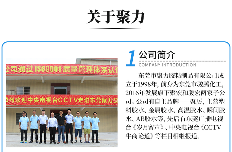 聚力膠業擁有多年的研發生產膠水經驗,專注生產特種膠、高溫膠水,塑料膠水、金屬膠水、環氧ab膠和工業修補劑等多種膠水,專人提供技術支持,解決工藝難題,免費提供樣品測試。