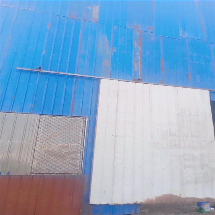 將水性彩鋼翻新漆攪拌均勻,用噴涂機均勻噴刷。噴刷基面干燥無浮土。環境溫度為: 23℃,8h內結膜,環境溫度低長些,反而短些。一遍固化后,在涂刷二遍,涂刷方向必須和一遍相垂直,如需細節加固,可使用密度玻璃絲布或本公司自粘防水卷材。