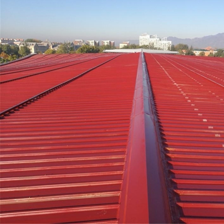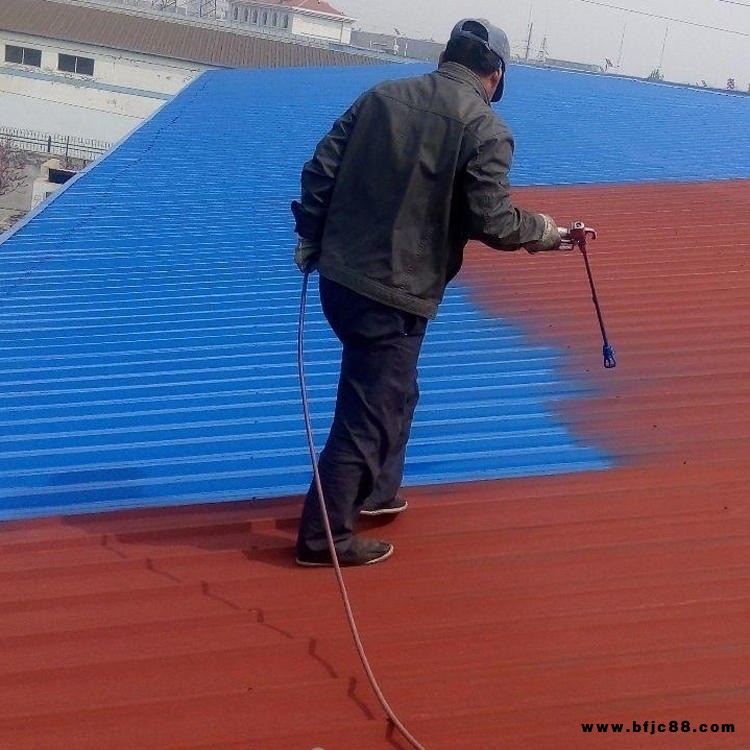 將水性彩鋼翻新漆攪拌均勻,用噴涂機均勻噴刷。噴刷基面干燥無浮土。環境溫度為: 23℃,8h內結膜,環境溫度低長些,反而短些。一遍固化后,在涂刷二遍,涂刷方向必須和一遍相垂直,如需細節加固,可使用密度玻璃絲布或本公司自粘防水卷材。