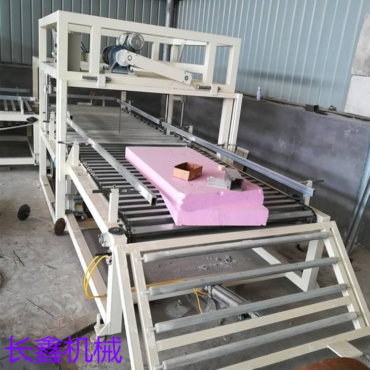 3.防滑皮帶會把兩個切割好的方料輸送到多片鋸切割處,【多片鋸的尺寸會根據客戶的要求定制】切割鋸會快速把方料切割成若干成型的保溫板,這里變完成水泥發泡保溫板的切割。