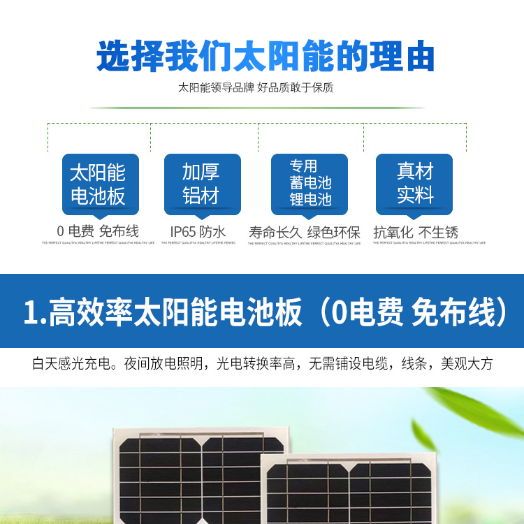 具作為光源,并由智能化充放電控制器控制,用于代替?zhèn)鹘y(tǒng)公用電力照明的路燈。無需鋪設(shè)線纜、無需交流供電、不產(chǎn)生電費(fèi);采用直流供電、光敏控制;具有穩(wěn)定性好、壽命長、發(fā)光效率高,安裝維護(hù)簡便、安全性能高、節(jié)能環(huán)保、經(jīng)濟(jì)實(shí)用等優(yōu)點(diǎn)。可廣泛應(yīng)用于城市主、次干道、小區(qū)、工廠、旅游景點(diǎn)、停車場等場所。產(chǎn)品部件燈桿結(jié)構(gòu):鋼質(zhì)燈桿及支架,表面噴塑處理,電池板連接采用專用防盜螺絲。