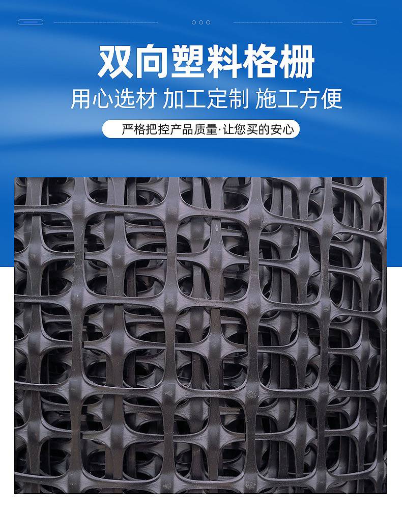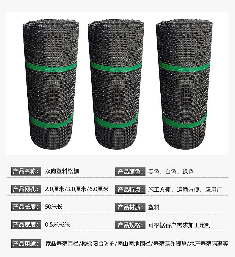 雙向土工格柵是用pp顆粒通過擠壓、成板、沖孔過程后再縱向、橫向拉伸而成。該材料在縱向和橫向上都具有很大的拉伸強(qiáng)度。由于其特性,不怕雨淋,不怕日曬,透氣性好,也可用于畜牧養(yǎng)殖,果園圍欄等方面,農(nóng)作物晾曬等方面