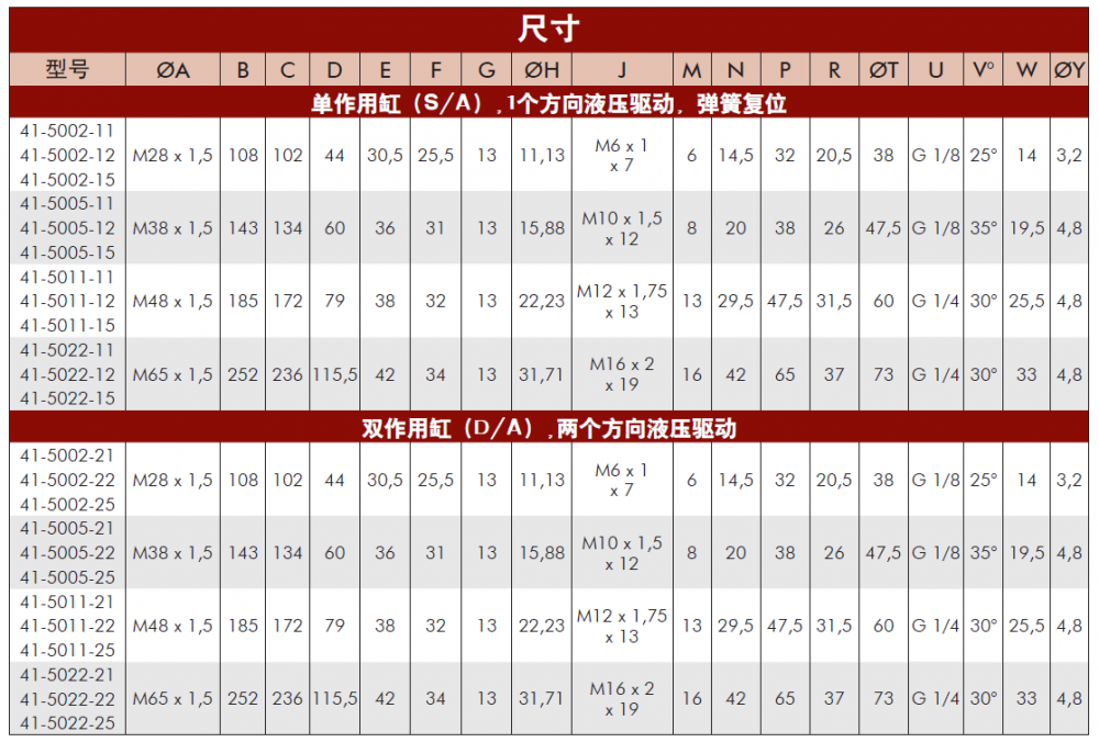 美國VEKTEK威克泰克標準型油缸尺寸表: