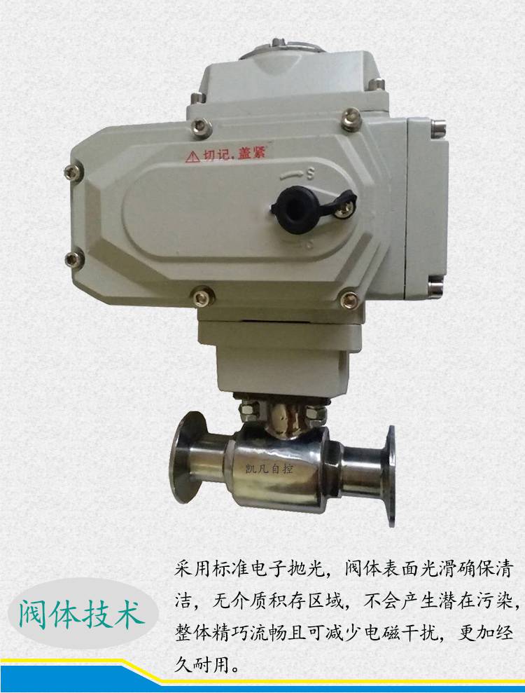 電動衛生級卡箍球閥皆經過了精密的檢測流程和嚴格的品質管理,流通經過精密拋光和除菌處理,采用了全包的F4密封,沒有死角且容易清洗。執行器與球閥連接無需支架,減少了因安裝連接引起的質量問題,同時也為密密麻麻的設備節約了空間。 |