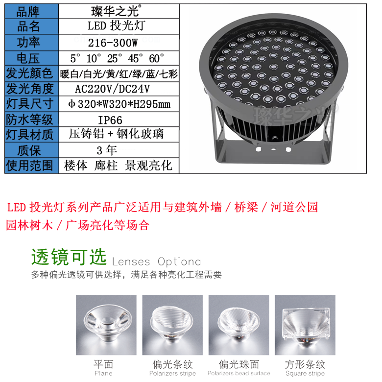 主要適用范圍 : | 適用于外墻建筑、廣場燈光、園林樹木等場合 | 尺寸規(guī)格 : | φ180*180*H228mm |