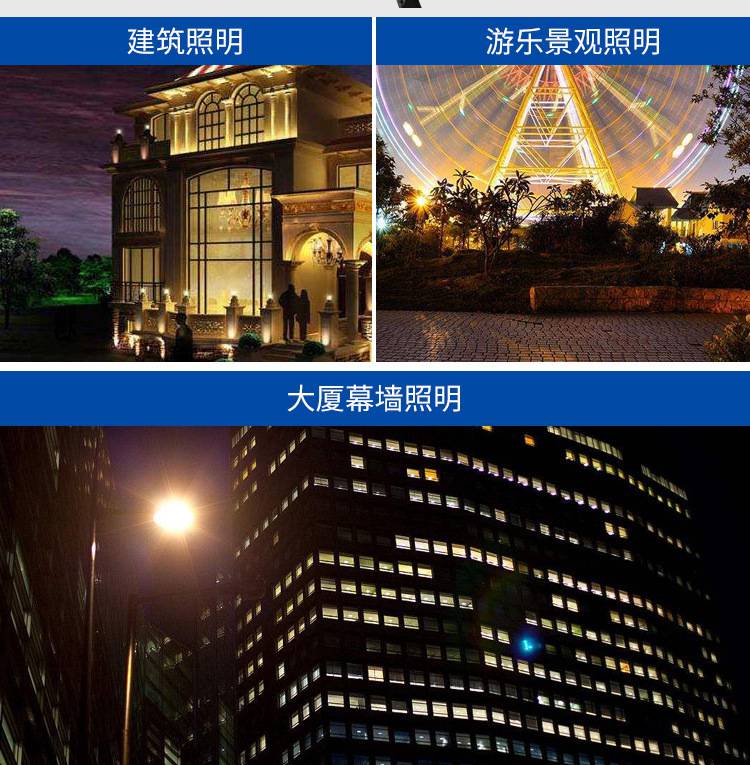 應(yīng)用:酒店外墻照明、樓體亮化、橋梁照明、廣場(chǎng)園林照明、旅游景點(diǎn)等亮化場(chǎng)所。