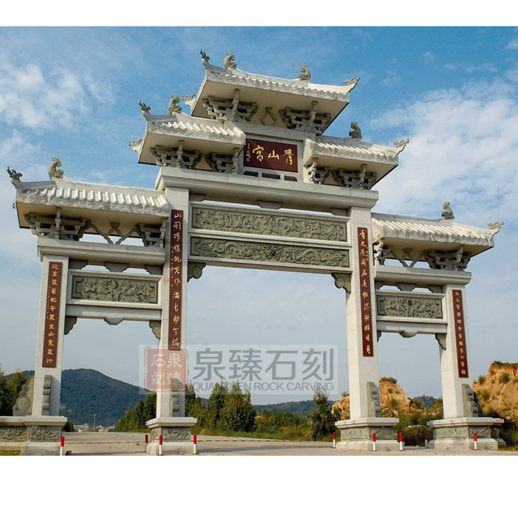 寺院石牌坊為封建社會為表彰功勛、科第、德政以及忠孝節義所立的建筑物。也有一些宮觀寺廟以石雕牌坊作為石雕山門的,寺院石牌坊又名石雕牌樓。石雕牌坊也是祠堂的附屬建筑物,昭示家族先人的高尚美德和豐功偉績,兼有祭祖的功能。其中為的是石雕貞潔牌坊與石雕忠孝牌坊。